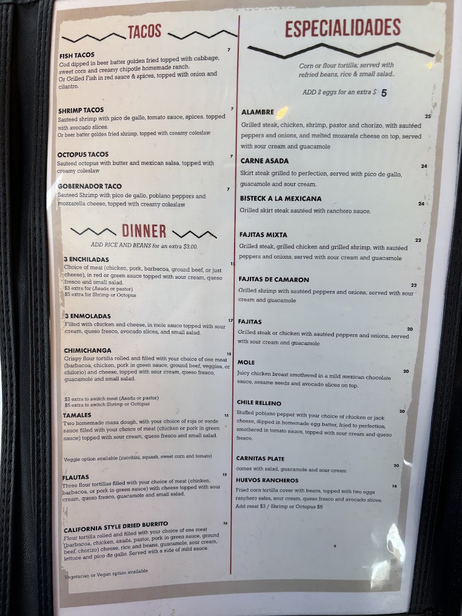 Perfect for sharing or enjoying solo, appetizers like the quesadilla and chips with salsa—available for refill—set a sociable tone, while traditional desserts like flan and deep fried ice cream offer a comforting finish. Refreshing beverages such as the strawberry margarita or a michelada provide a gentle contrast to the rich flavors of the food, fitting well with the casual, cozy atmosphere.
